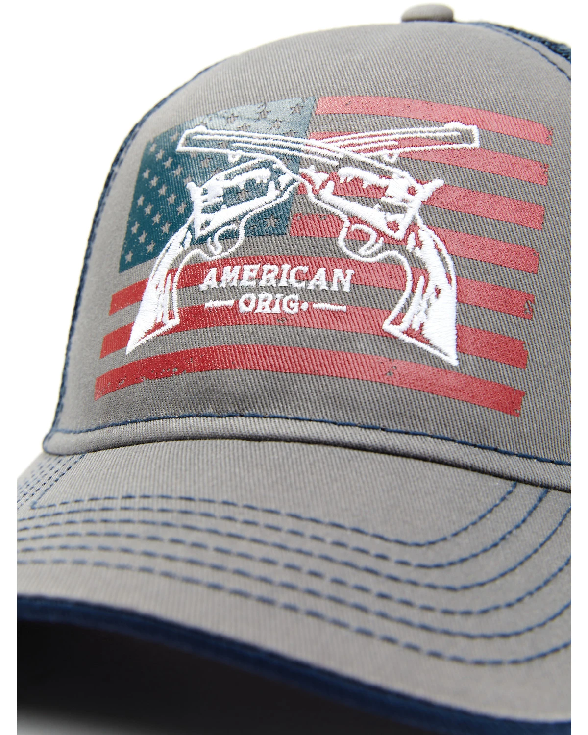 - Stitched duel revolvers with American flag graphic on front