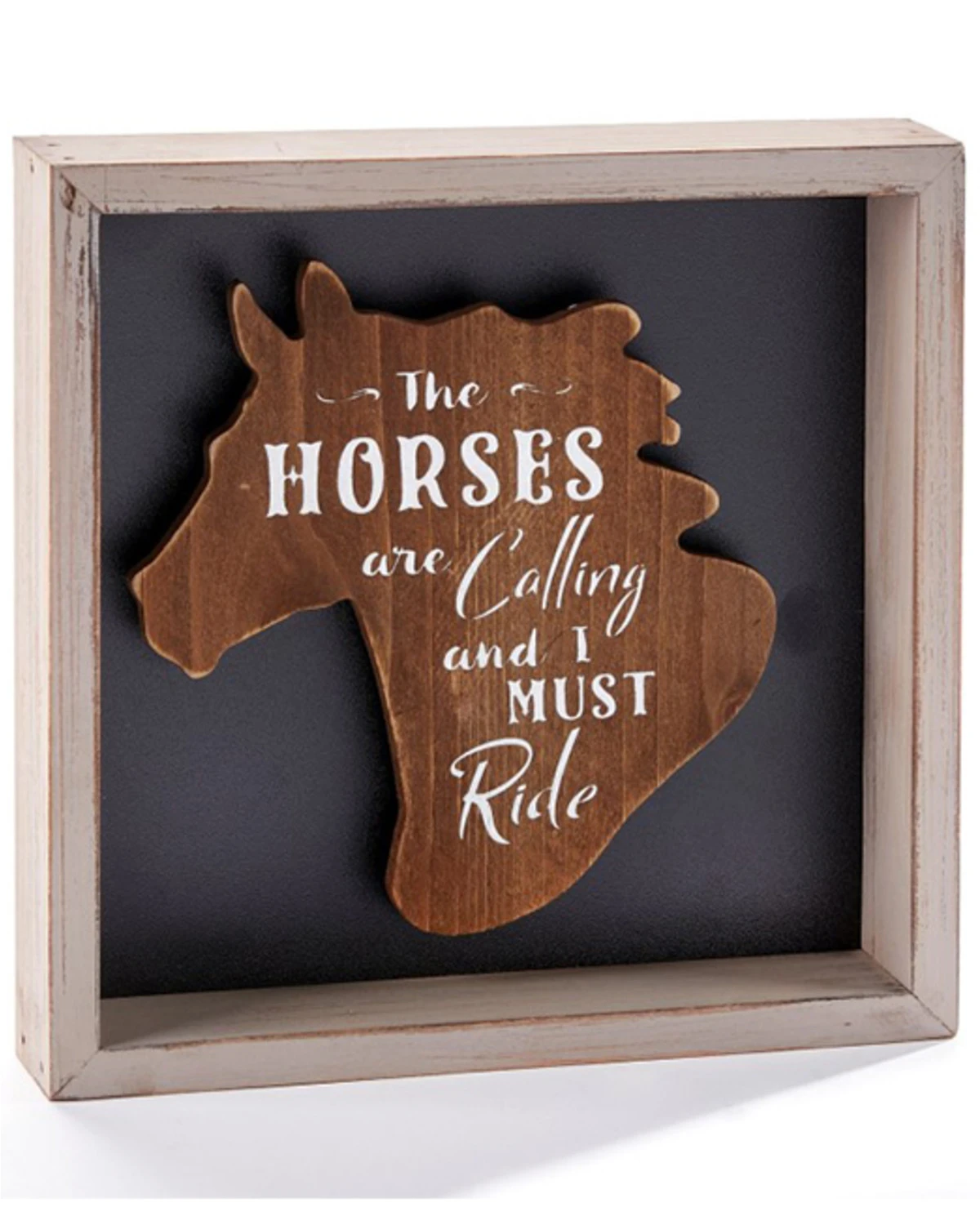 - Distressed wood-stained horse head silhouette cutout with “The Horses are Calling and I Must Ride”