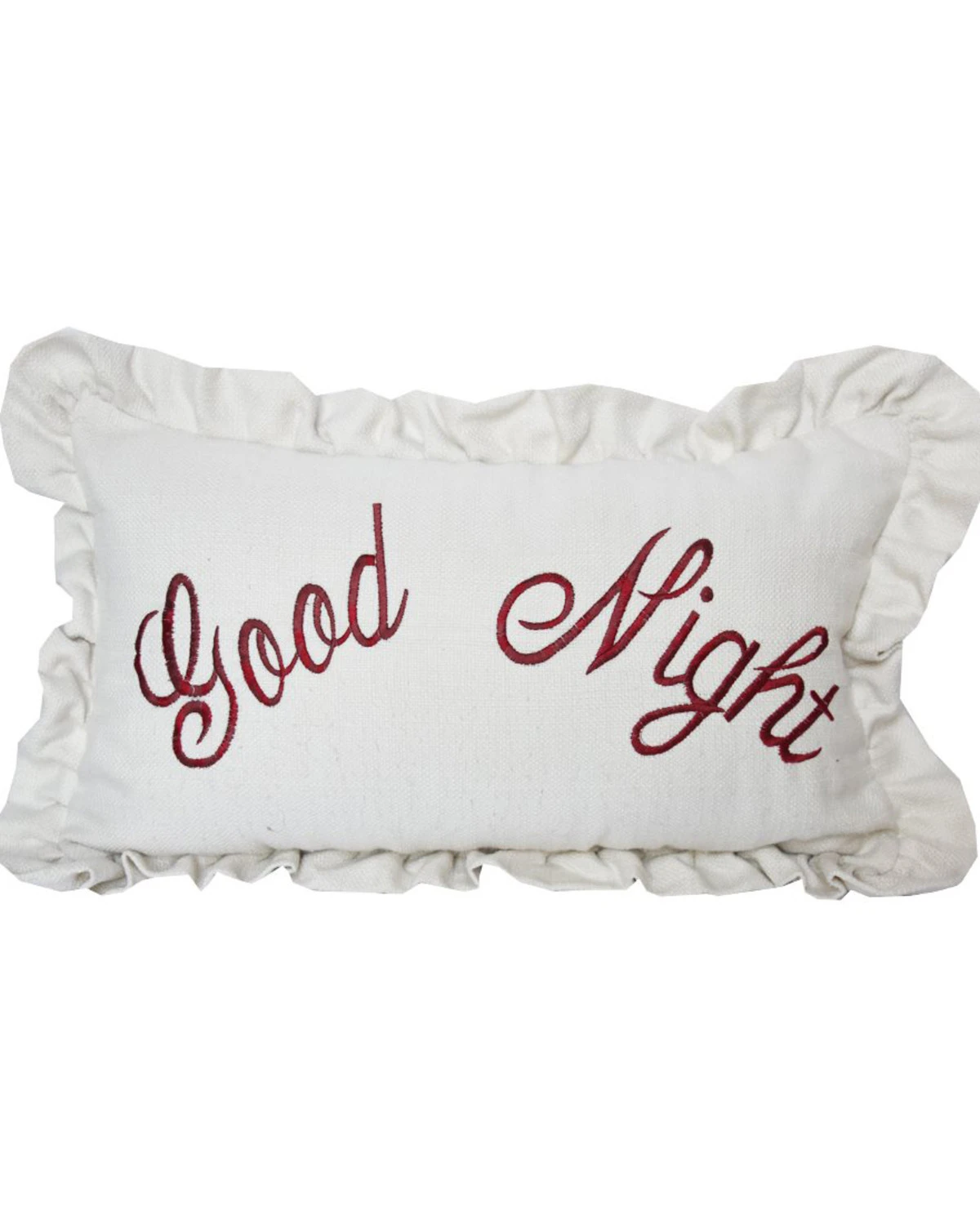This creation comes from none other than HiEnd Accents, a company that specializes in only the best western and home decor. This sweet pillow would be a perfect addition to any home or bedroom. The white pillow has ruffled edges and red embroidery with zipper closure for ease of use. While this pillow is a part of the Bandera bedroom collection, it can stand alone as a single piece and it measures at 14×24.