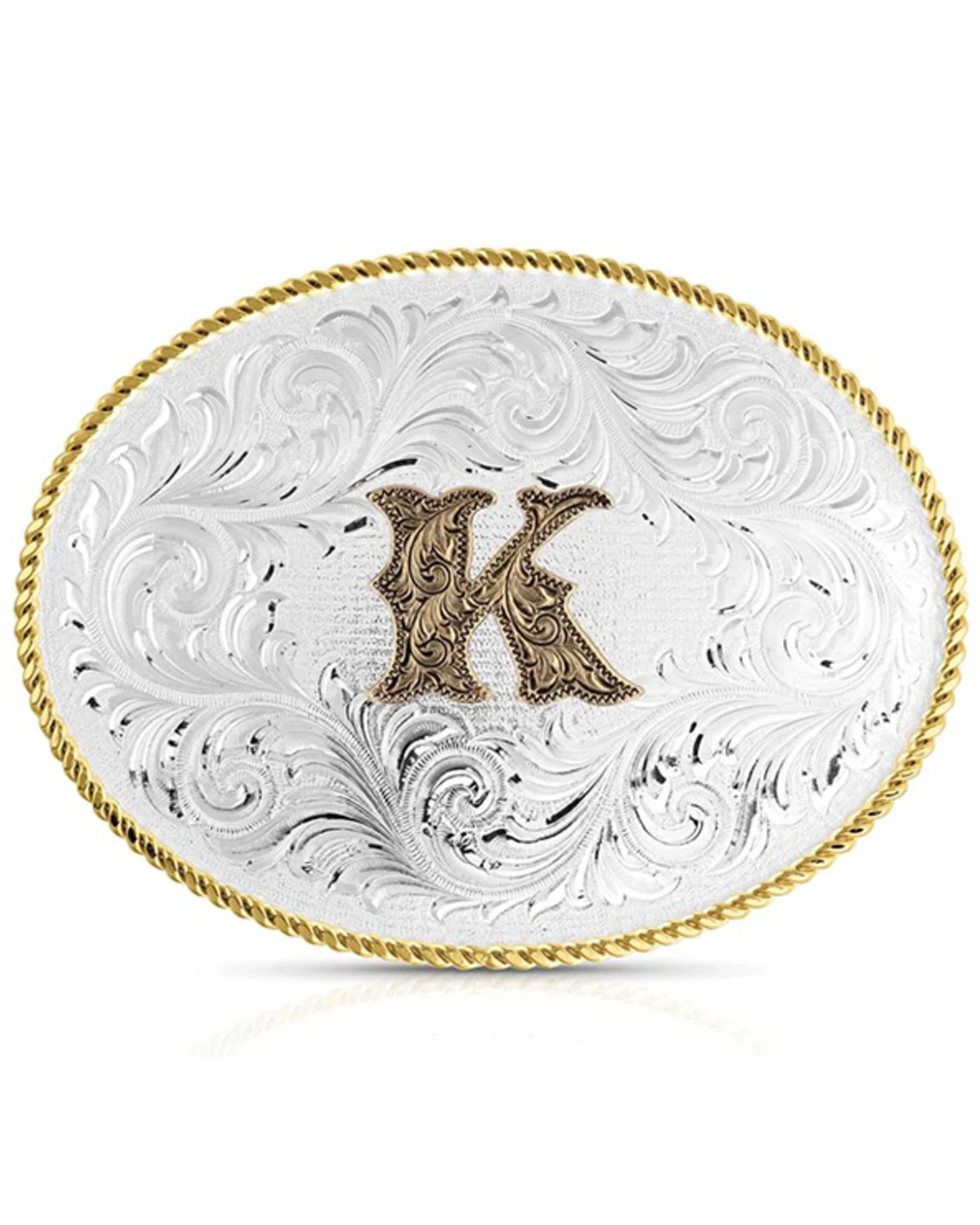- Silver-toned oval buckle with gold roped border and “K” on front with silver-toned filigree details
