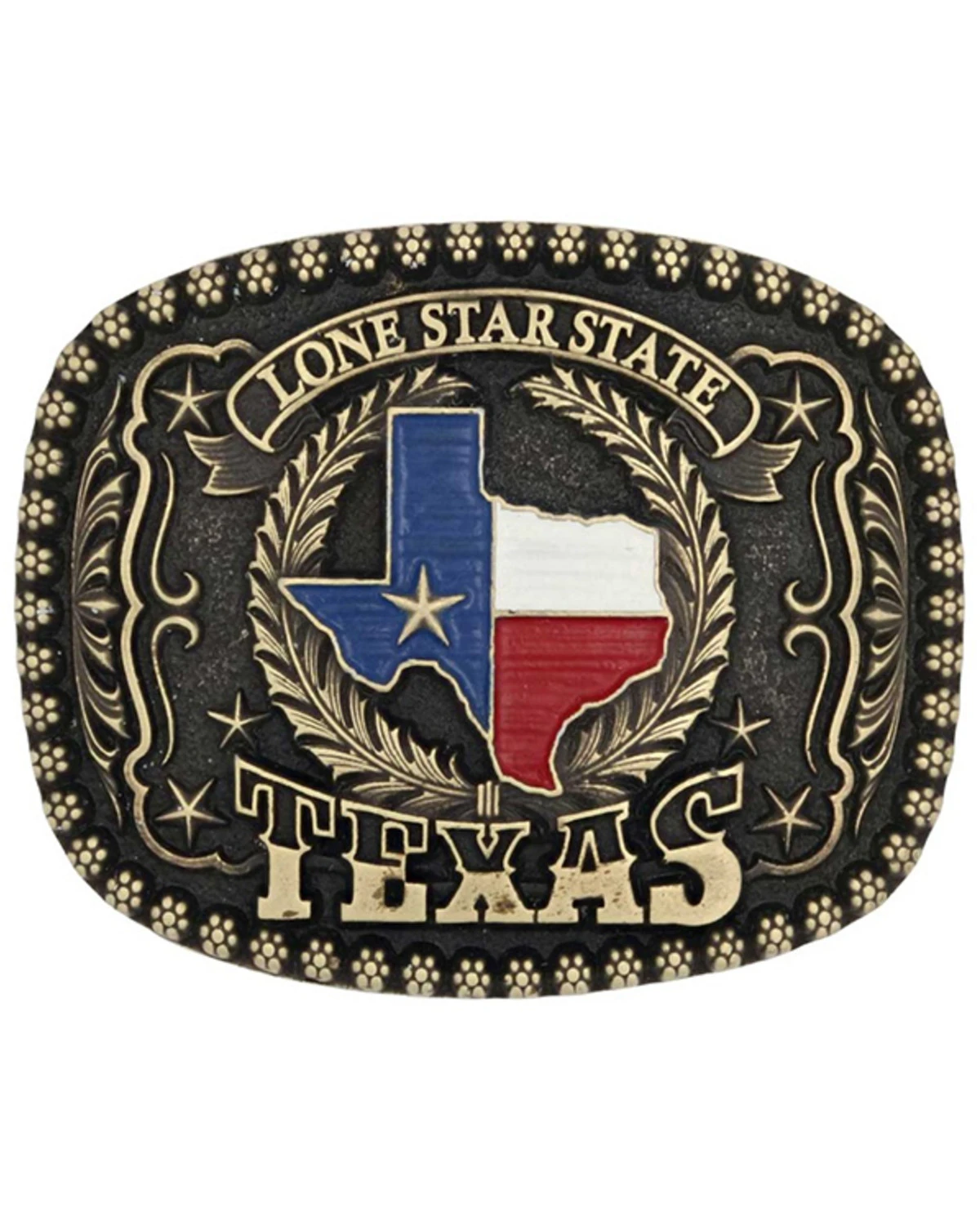 - Rectangular buckle with “Lone Star State Texas” and painted Texas motif and star and filigree engraved details