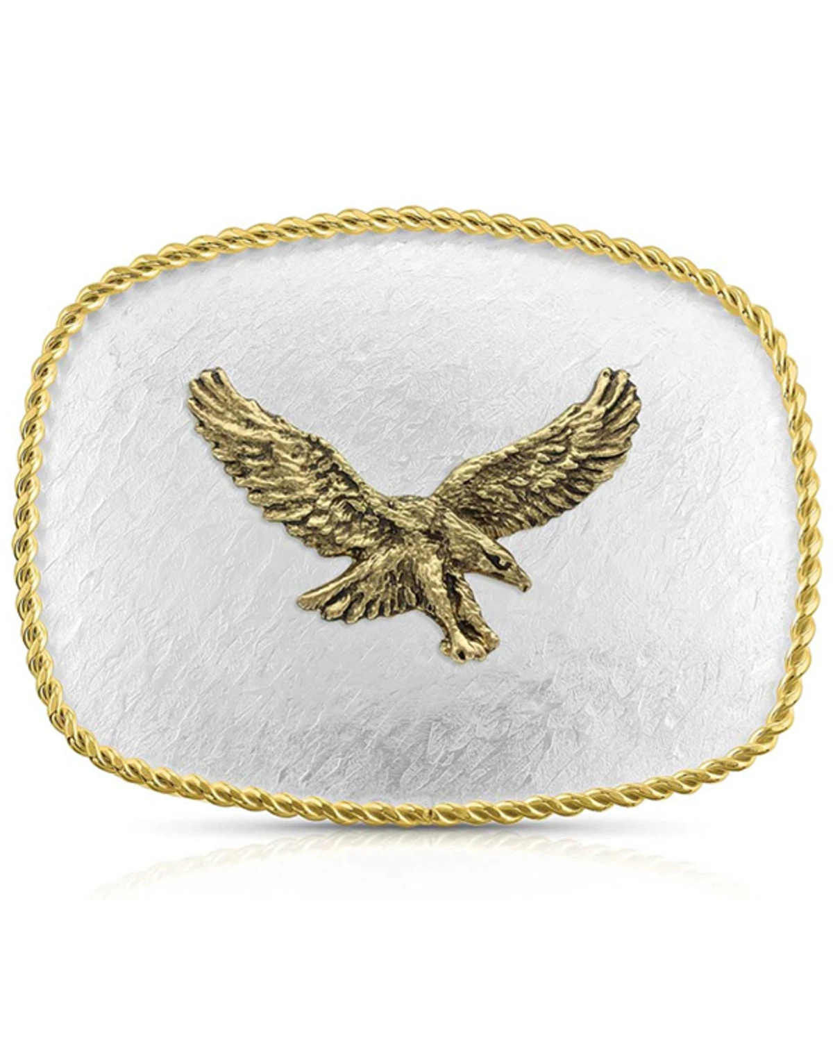 - Silver-toned rectangular buckle with gold roped edge and soaring eagle in center