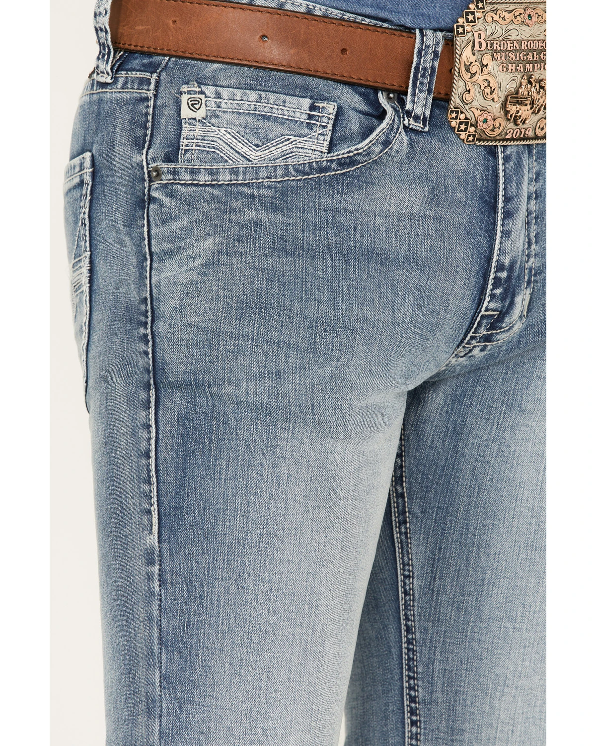 - Five-pocket design with signature embroidery on back
