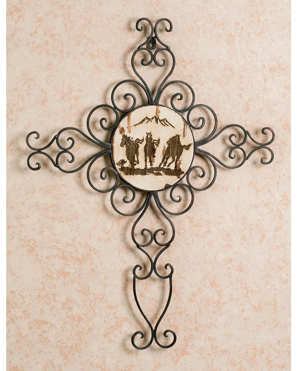 This metal wall cross is the perfect addition to any western-inspired room. This elegantly designed metal cross features a wooden center with engravings. Cross measures 27″ x 21″.